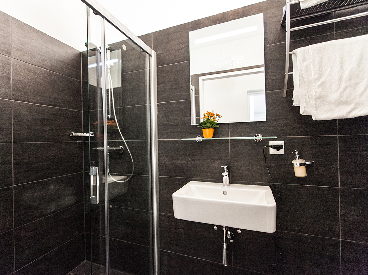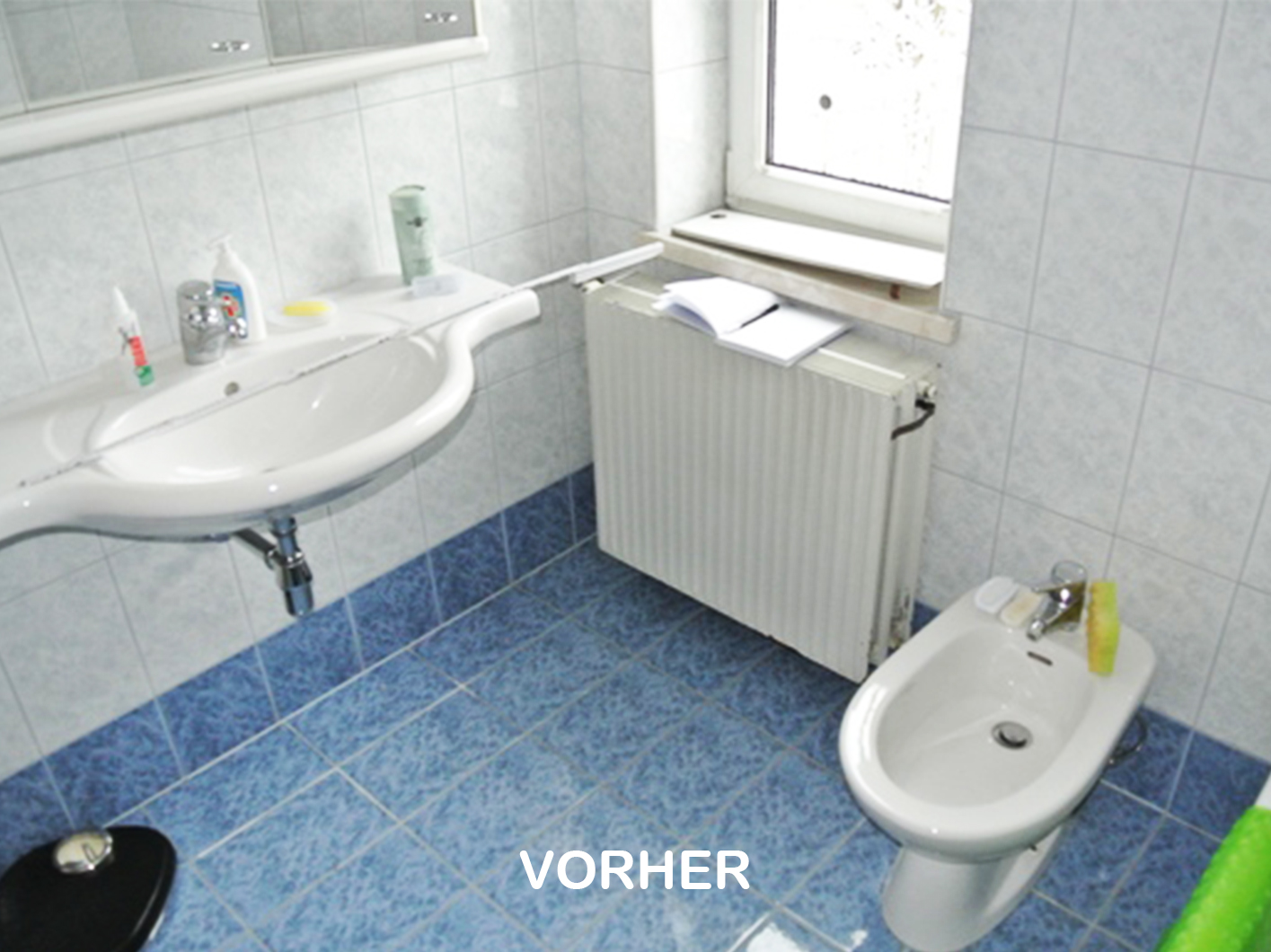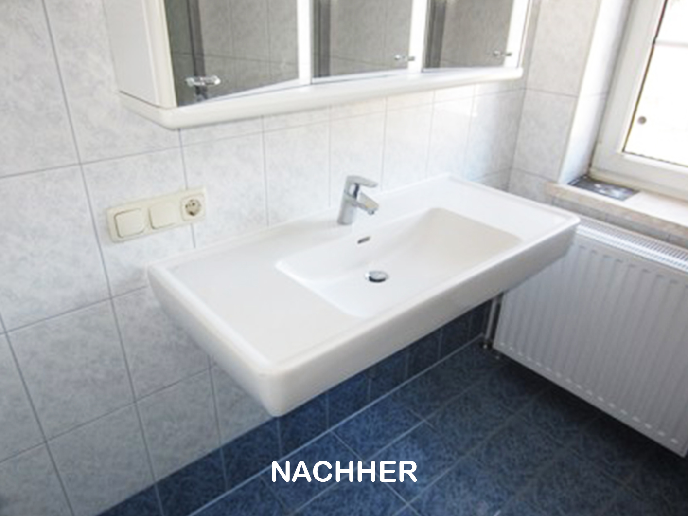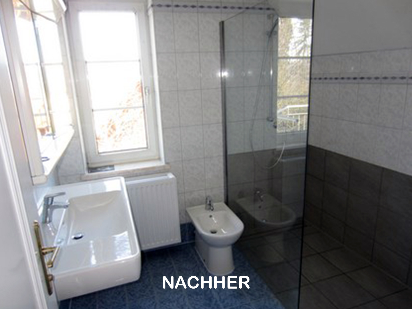 Die Badewanne wurde durch eine bodenebene Walkin- Dusche mit Duschrinne ersetzt. Da die restliche Verfliesung und Installation noch in guten Zustand waren, wurden sie beibehalten.