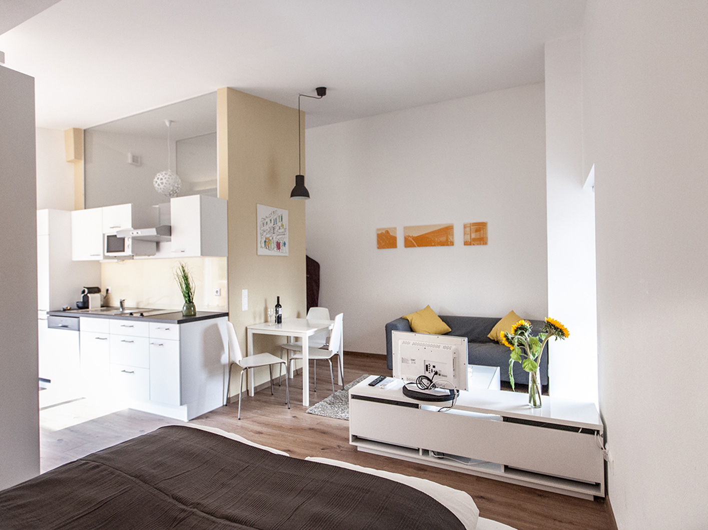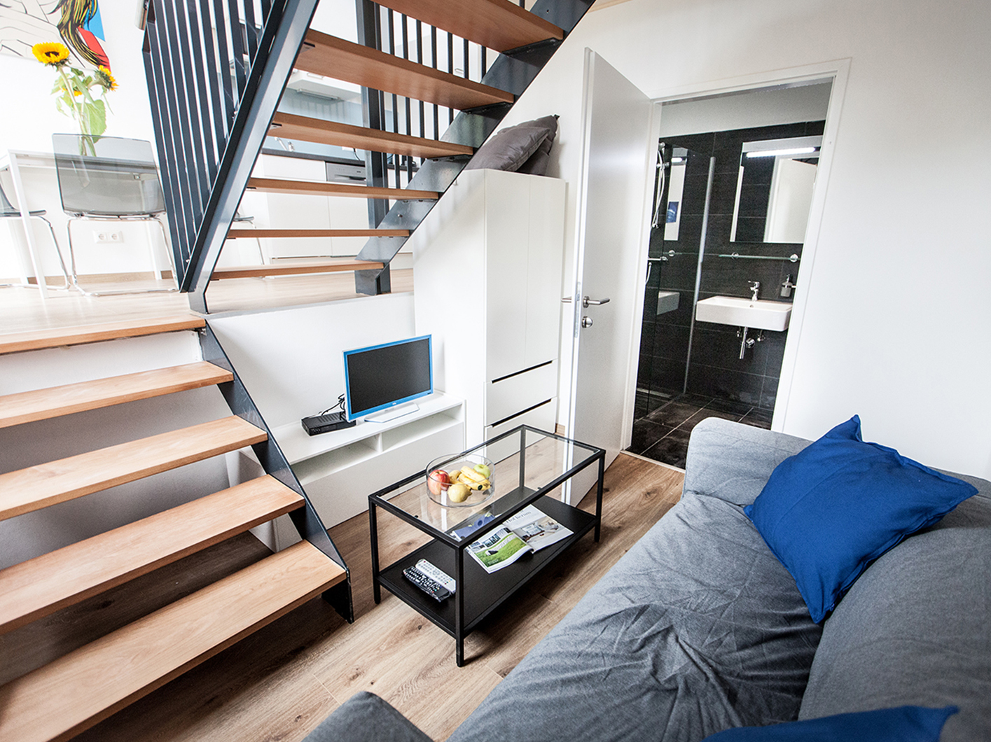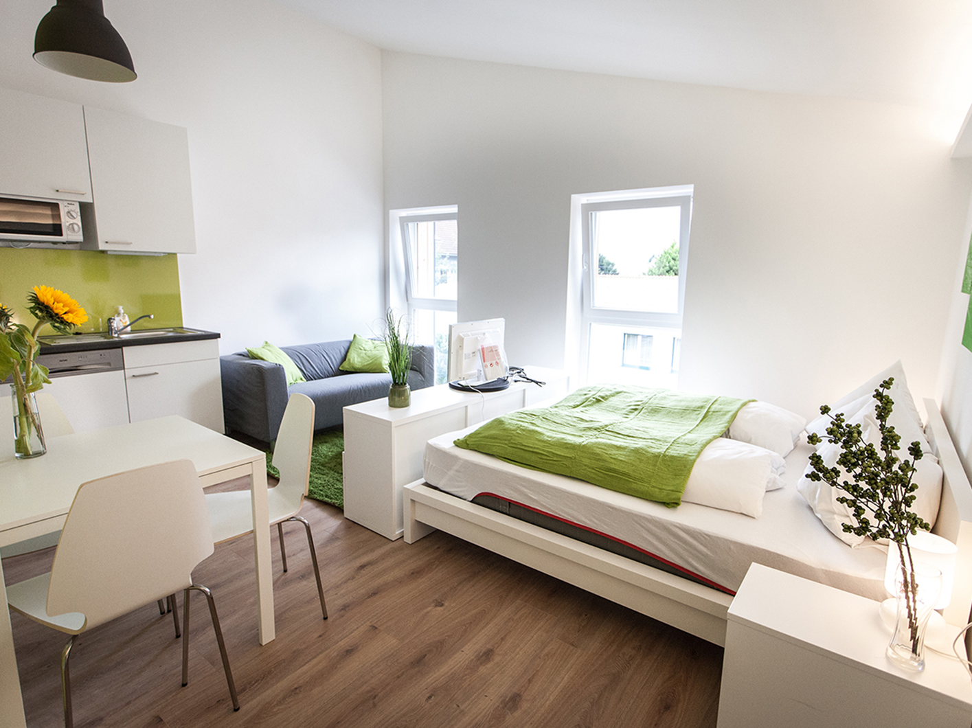Das Obergeschoß des Einfamilienhauses in zentraler, ruhiger Lage wurde ausgebaut um Platz für vier helle, offene Apartments zur Vermietung zu schaffen. Jedes Apartment verfügt über ein modernes Bad und eine eigene Küche. Für ein wohliges Klima sorgt die effiziente Luftwärmepumpe mittels Fußbodenheizung.